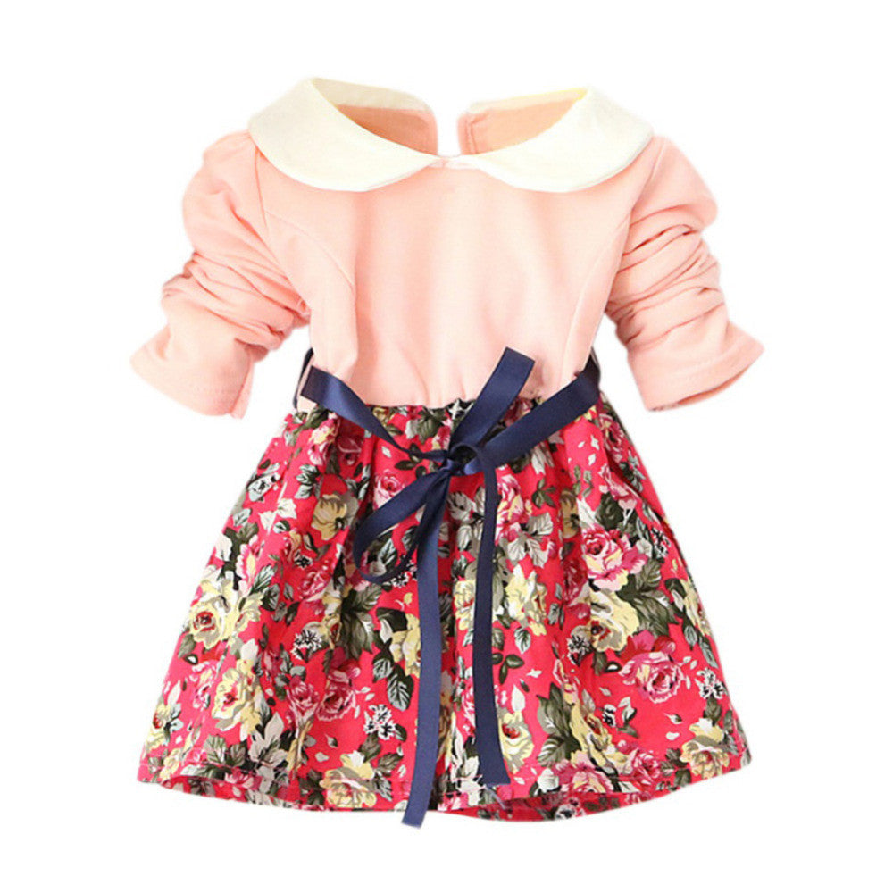 1~5 years kids baby girls princess long sleeve pleat floral bow mini dress party tutu dresses TIML66
