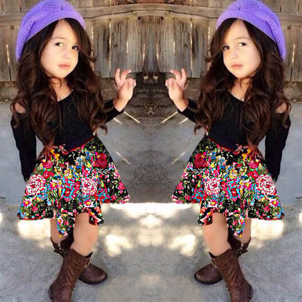 2-7Y Girls Clothing Sets 2pcs Black Long Sleeve Shoulder Off Top + Floral Skirt Baby Clothes Dress TIML66
