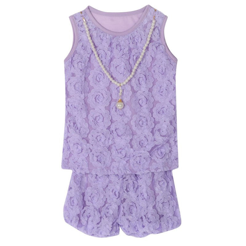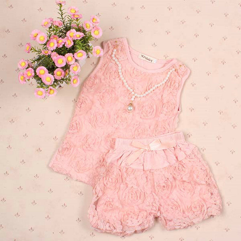 2 Pieces/set Kids Girls Clothes Sets Rose Flower Top Shirt + Bloomer Short Pants + Pearl Necklace Outfits TIML66
