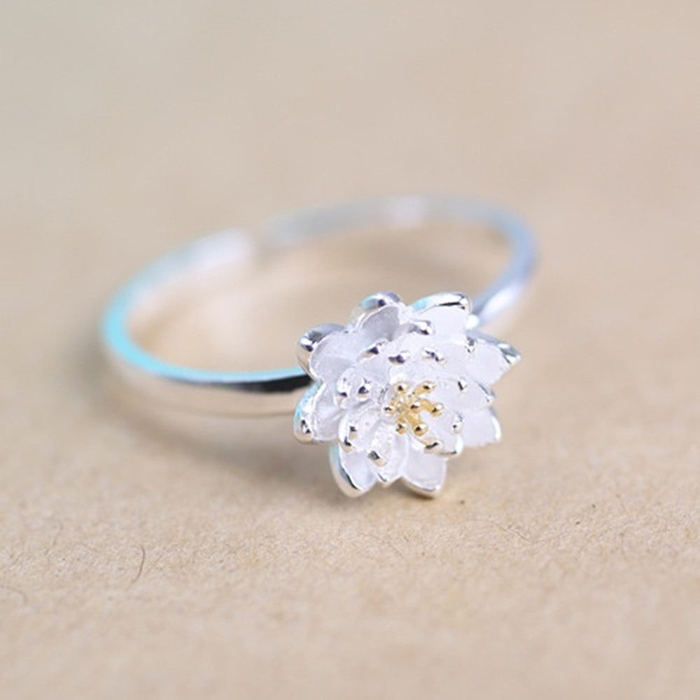 romantic lotus flower plant silver sterling silver adjustable ring jewelry accessory for women girls bride wedding party TIML66