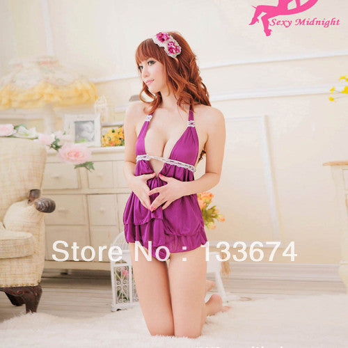 sexy purple halter v neck lingerie sleepwear handsome backless skirt g-string set TIML66
